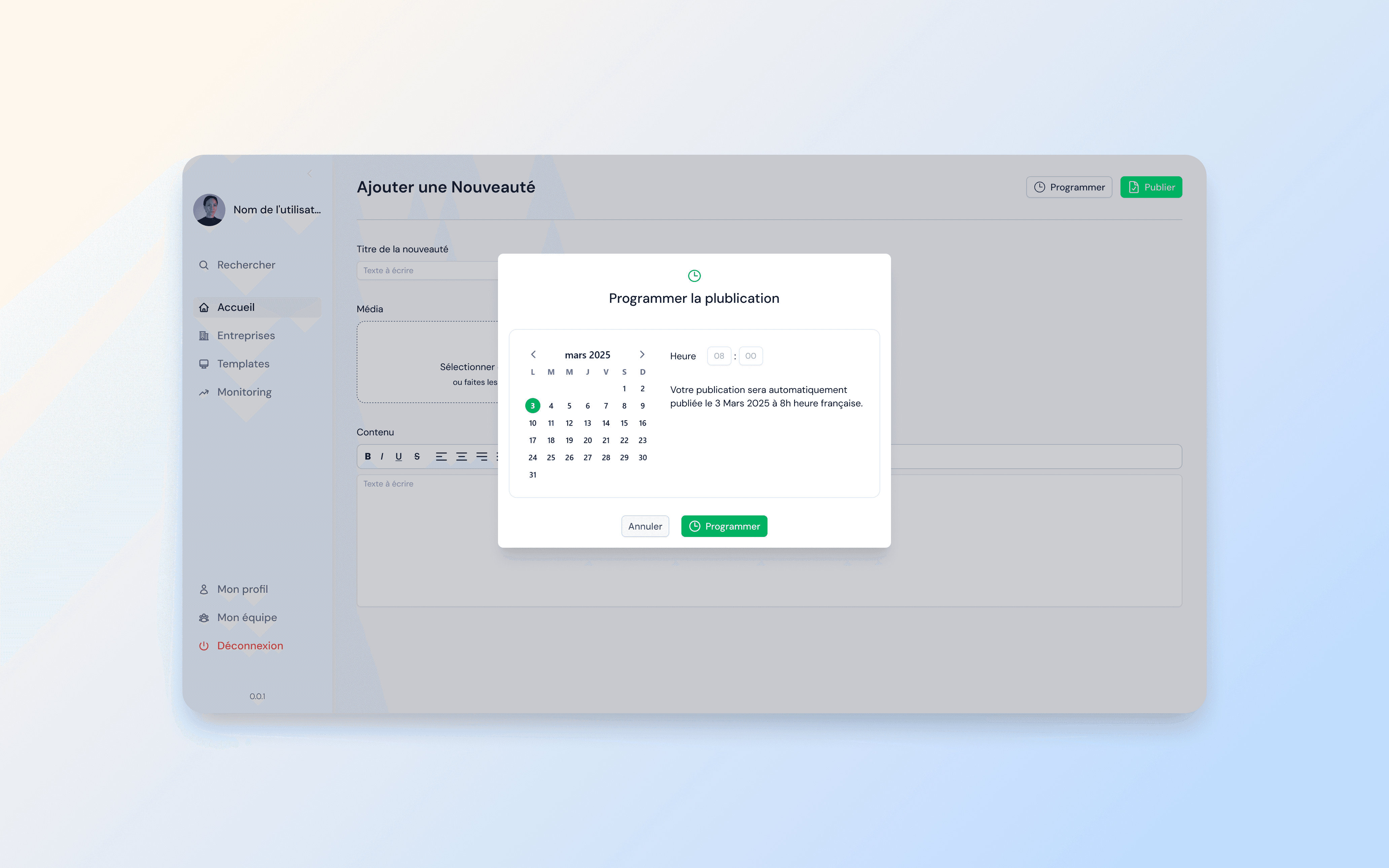 Scheduling modal: date picker with time selection and automatic publication confirmation.