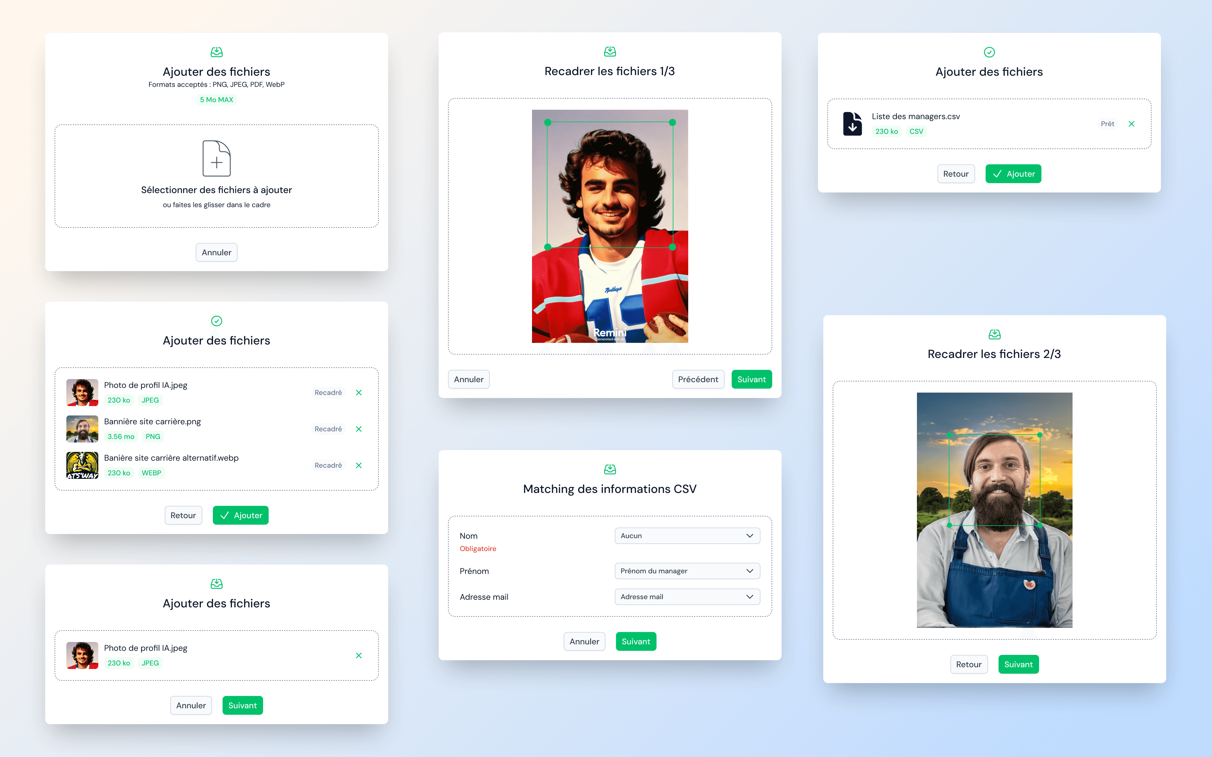 Modal system: file upload, image cropping, CSV field matching, and completion states. One pattern, multiple use cases.