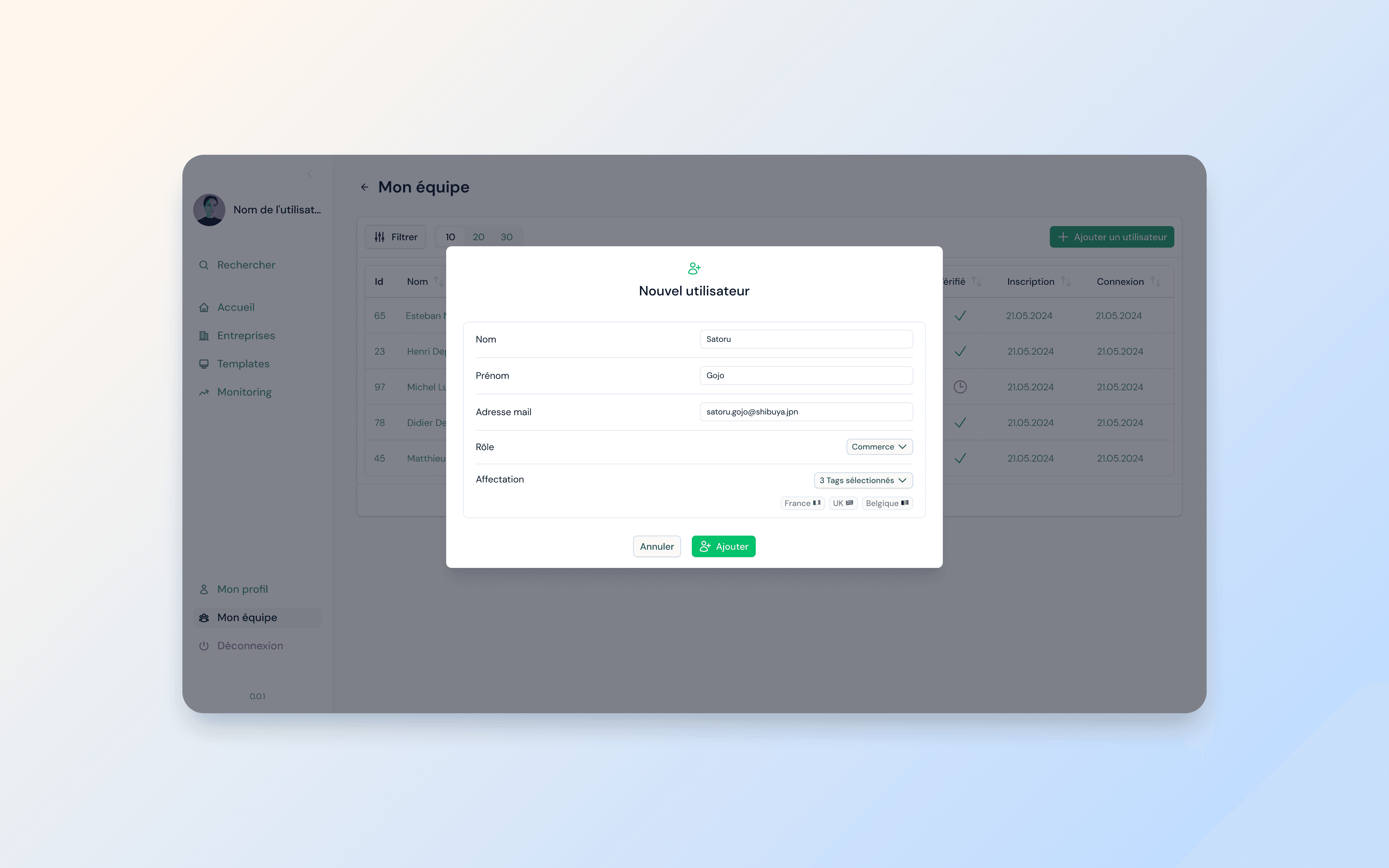 Team management: user list with creation modal. Role assignment and multi-country scope.