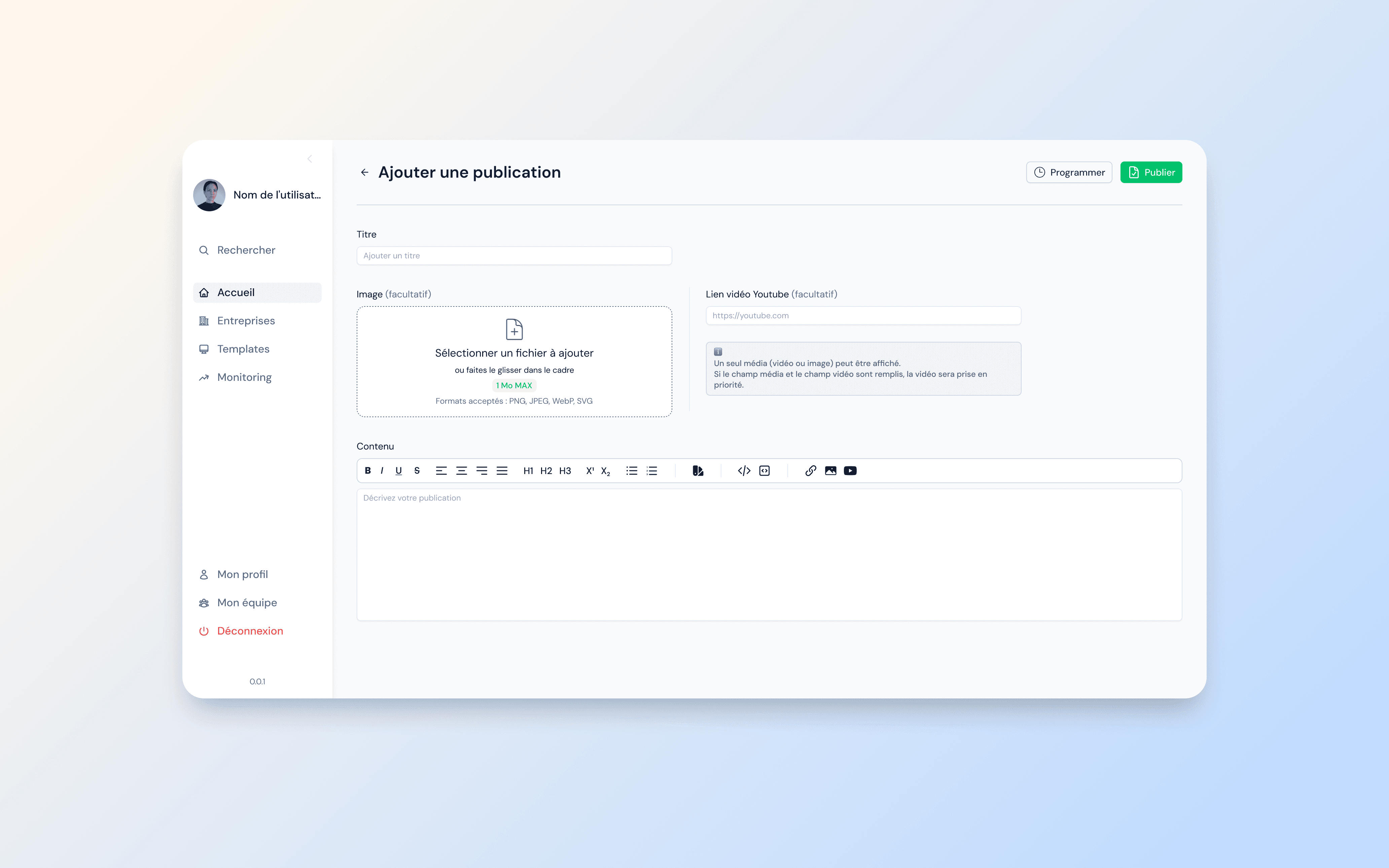 Publication editor: title, media upload, YouTube embed, and rich text content.