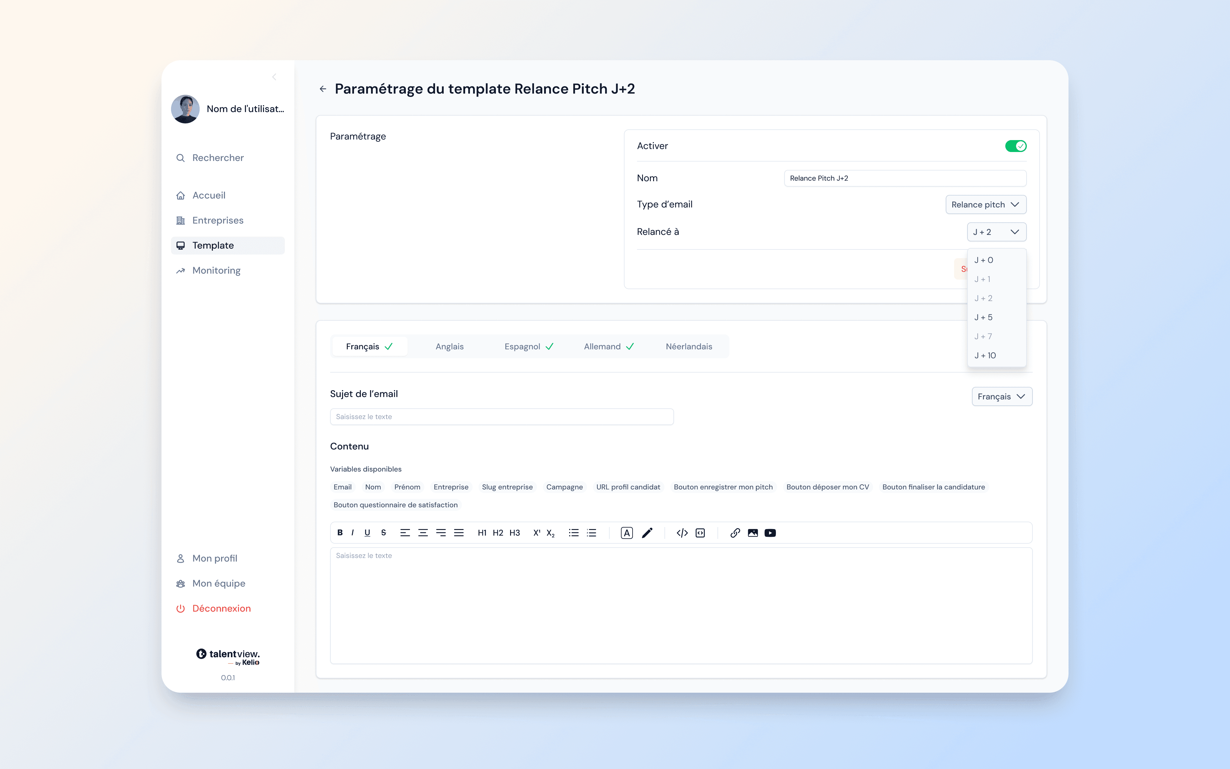 Email template editor: multi-language tabs, dynamic variables, scheduling rules, and rich text formatting.