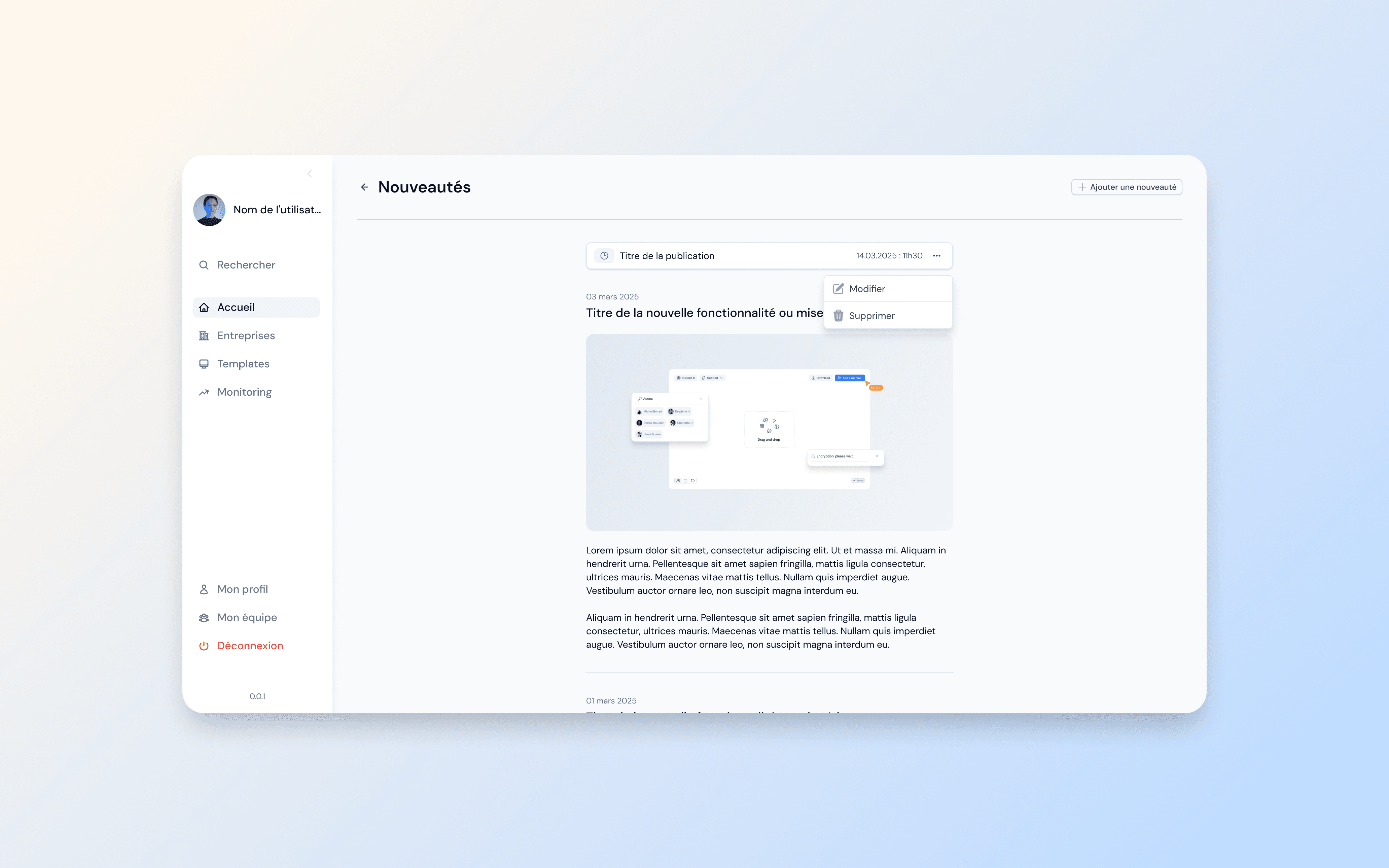 We introduced a new section for product updates, directly inside the admin. Users can create, schedule, and publish announcements with a rich text editor, image or video attachments, and a scheduling calendar with time selection.
